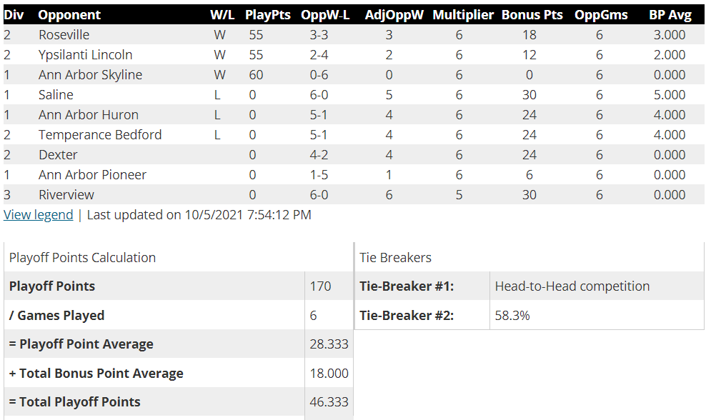 There’s just one problem with using the data on the MHSAA website: it tells an incomplete story. This has to do with how one portion of the playoff point metric is calculated, what the MHSAA terms ‘bonus’ points. Your team earns bonus points for the wins of its opponents - for example, if your team played a Division 1 opponent and lost, but that opponent won 6 of its 9 games, your teams would be credited 4 ‘bonus’ points towards its overall playoff point calc.
