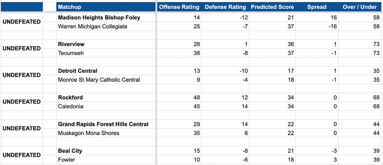 Beyond the Riverview / Tecumseh matchup, there are 5 games where an undefeated team is projected to either lose or win by a spread of only 3 points or less.