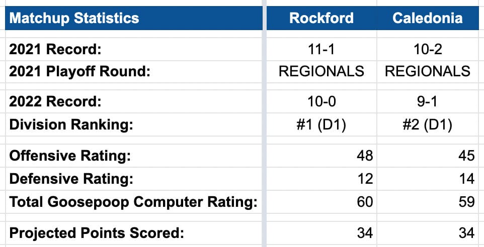A look at Caledonia’s game last week against Grandville shows you why: they bested a very good Dawgs team by 22, a margin of victory similar to Rockford’s margin over the Dawgs in Week 6. From the model’s perspective, Caledonia is clearly capable of performing at a level similar to that of Rockford’s.