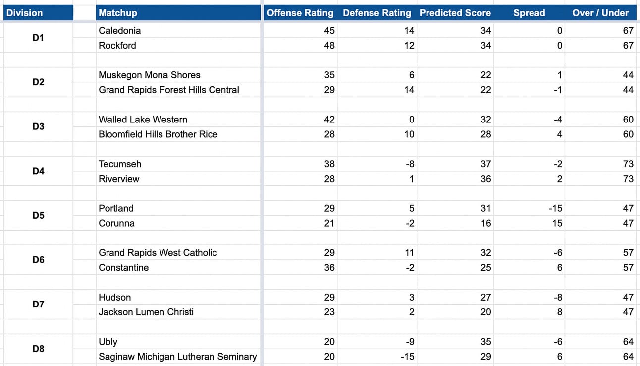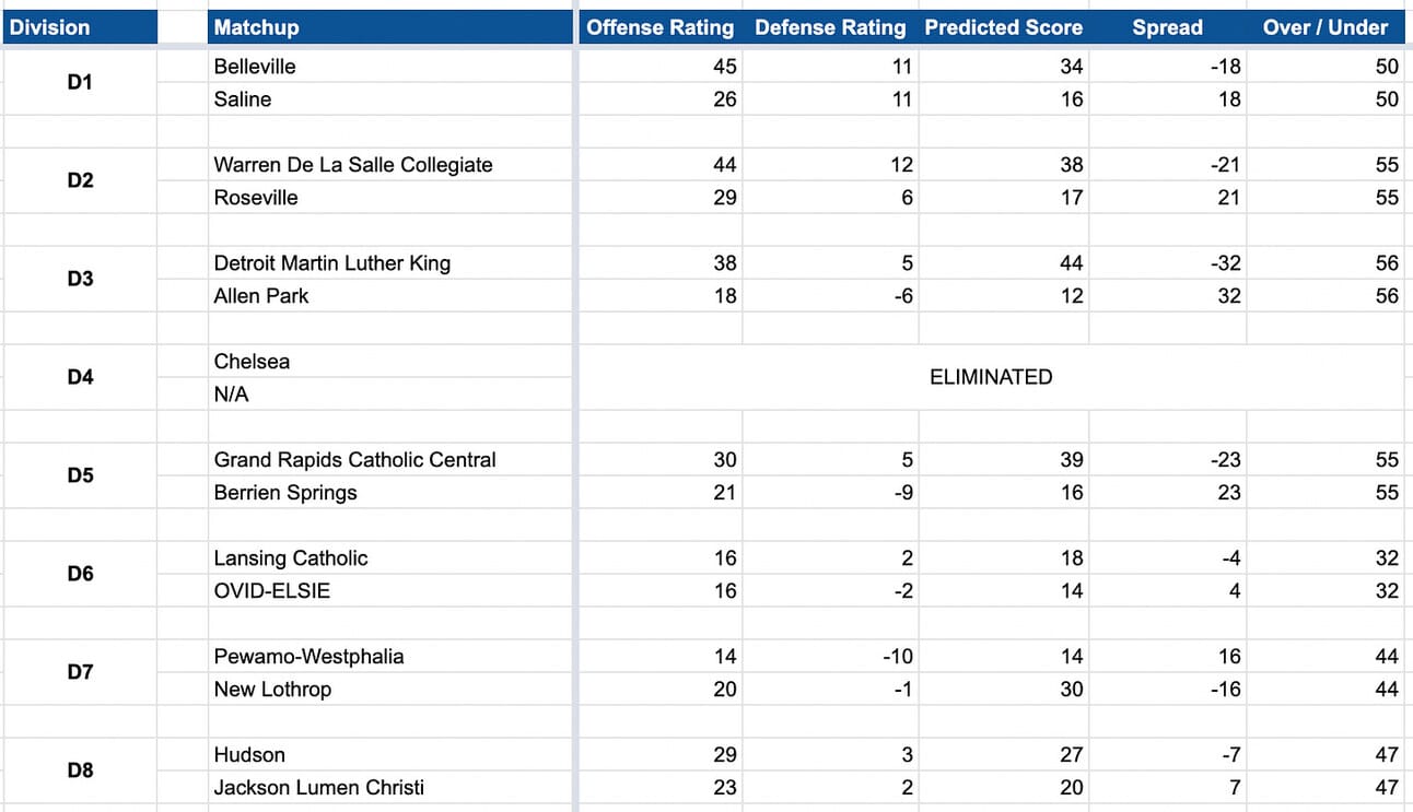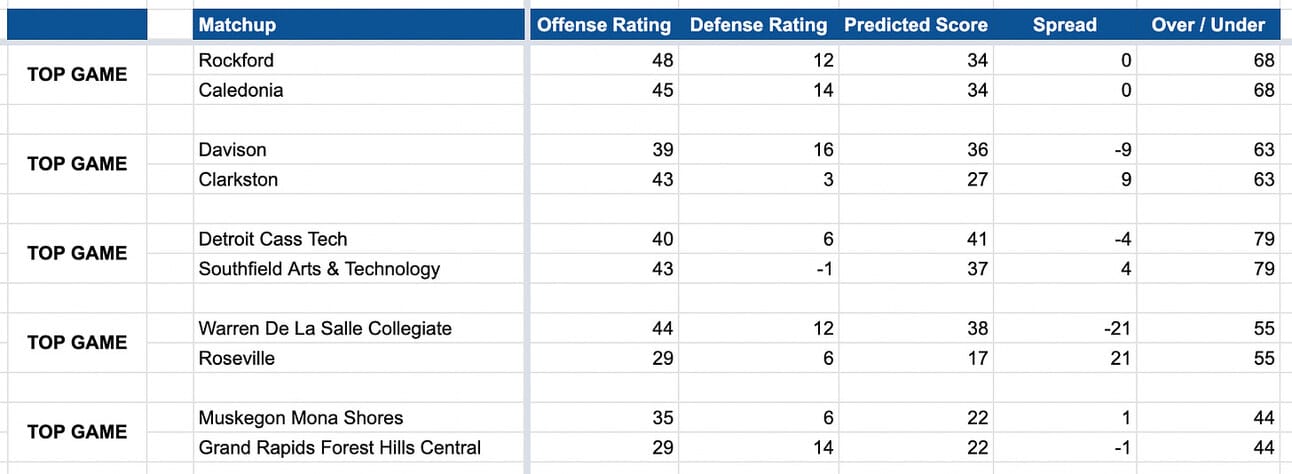 4 out of 5 of these games are projected within 1 point, with Bishop Foley being the lone double digit underdog - we’ve got returning State Finalist Michigan Collegiate favored by 16 over the Ventures.