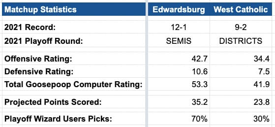 Not a ton of surprises here - based on last year’s record and playoff results, Edwardsburg would be your favorite. Both the model AND playoff wizard users agree with this approach - 70% of users in the Playoff Wizard have the Eddies winning, and the model has the Eddies as an 11 point favorite, with a projected score of 35 - 24. We will find out how correct we are when both teams take the field this Friday night at Hope College.