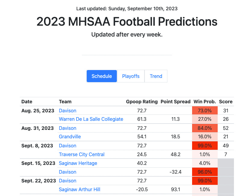 When’s the last time Muskegon started 1-3? 1999. The computer projects that to change this evening - we have Shores by 7, which represents a 59% win probability. However - fear not, Big Reds fans. Despite the slow start, the Computer still projects Muskegon to make the playoffs in 98.9% of scenarios. We even think they’re the 4th best team in Division 2…. they just happened to have played the #1 team in D1 (Rockford), #1 team in D2 (De La Salle), and #2 team in D2 (Mona Shores). That is almost certainly the State’s toughest schedule.